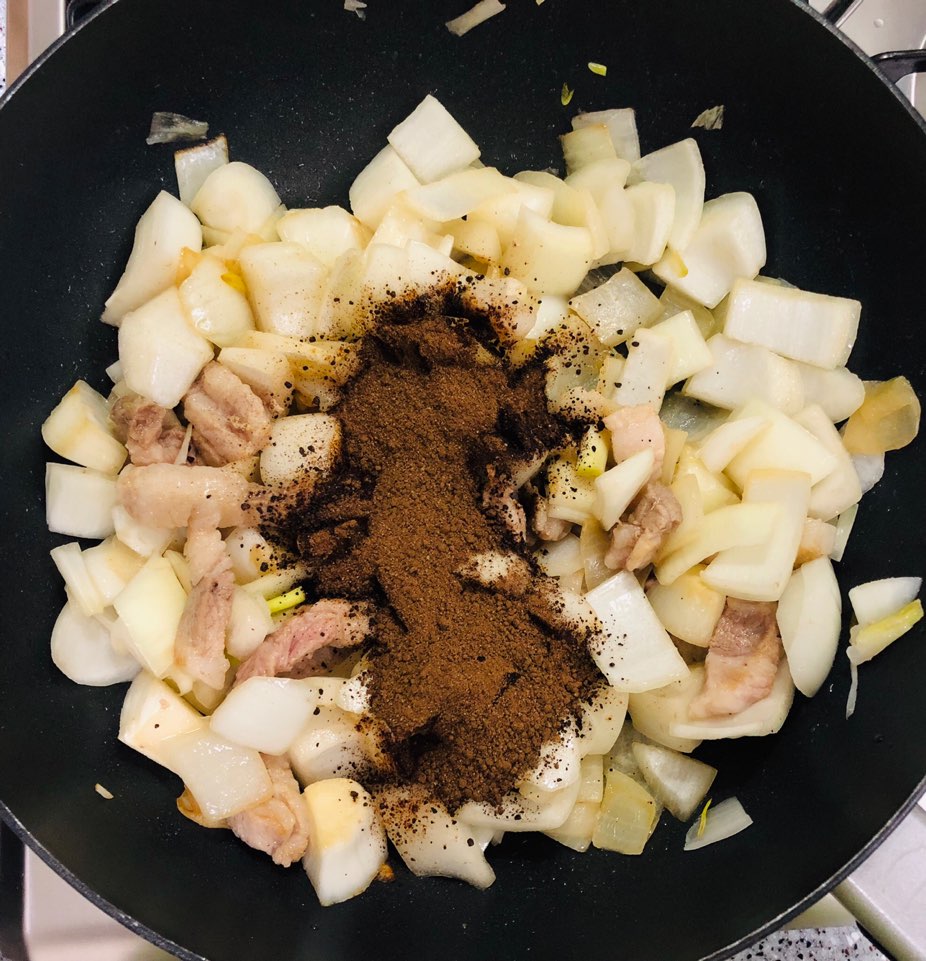 4. 양파와 고기가 얼만큼 익으면 스프 3개, 면 끓인 물 한 국자를 넣고
