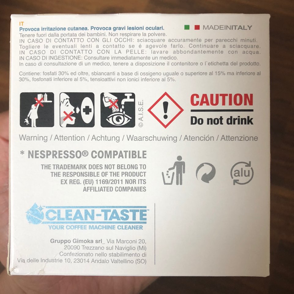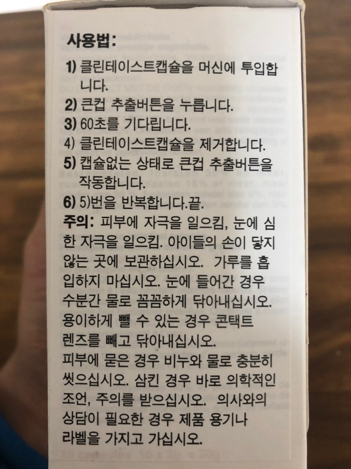 생긴건 이렇게 생겼습니다. 먹지마세요! 주의! 경고! CAUTION! 이런 문구가 많은 걸로 봐서는 굉장히 독한 성분의 세척제가 들어있나봅니다. ㄷㄷ;; 혹은 이게 커피 캡슐이라고 생각하고 내려 먹는 사람이 있을까봐 그런가.. ㅎㅎ 아무튼, 주의사항을 잘 읽어보도록 합시다.
