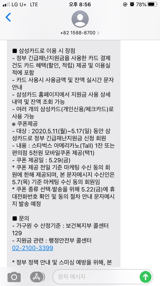 긴급재난지원금이 신용카드나 체크카드로 받는 경우가 대부분이기 때문에 카드사에서는 고객들을 잡기위해 다양한 홍보와 혜택들을 제시하고 있는데요. 저와 와이프한테도 계속 문자가 오더라구요. ㅎㅎ 저희가 받은 문자는 신한, BC, 우리, 삼성에서 문자를 받았는데요. 신한, BC카드에서는 혜택이 없었고, 삼성과 우리카드만 작은 혜택이 있었습니다.