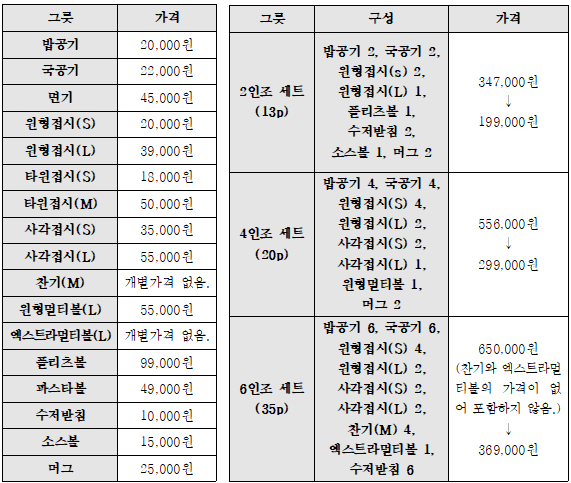 - 이건 세트로 산다고 해서 오덴세처럼 할인율이 많지 않고, 세트의 구성이 다양하지 못함. (김석빈 도자기 공식 홈페이지에서 가격 비교를 한 것이기 때문에 구입한다면 홈쇼핑 채널 등 다른 구입 채널에서 검색하여 구입하는 것이 공식 홈페이지 보다는 저렴할 것임)