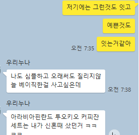 일단, 아래 카카오톡 대화에서 보이듯이 저희 누나 또한 심플하면서 질리지 않는 베이직한 그릇세트를 사고 싶어했습니다. 신혼 그릇으로 장만했던 그릇세트는 약간의 무늬가 있는? 그런 그릇세트였더라구요. 그래서 이번에는 질리지 않으면서 포인트를 줄 수 있는 그릇세트를 찾는 듯한 느낌을 받았습니다. 누나가 고민했던 브랜드 중 광주요를 보면 어떤 스타일인지 더 잘 알 수 있을 것 같아요.