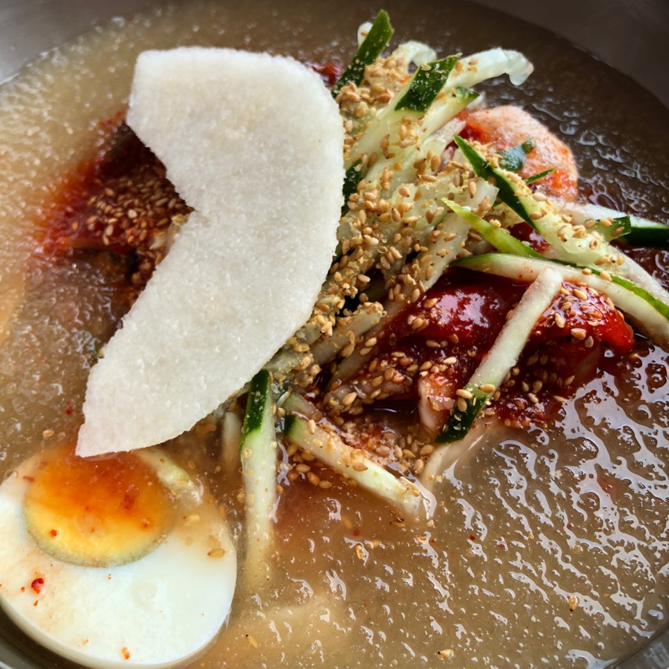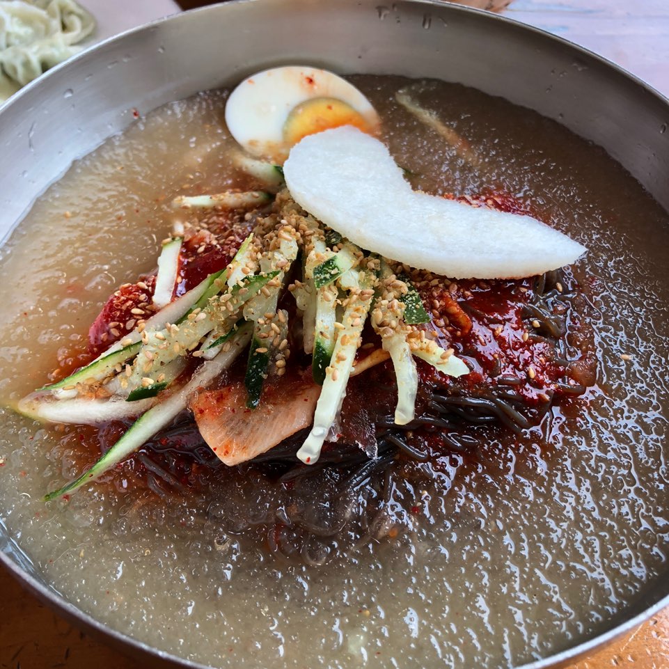 2) 물 냉면 : 물 냉면은 일단 엄청 시원합니다. 시원한 배, 오이, 쌈무가 재료도 신선하고 시원한 맛을 더해줬구요. 얼음이 동동동 아주 만족스럽습니다. 육수는 말 안해도 아시쥬? 그냥 JMT.. 저는 개인적으로 매콤한 양념이 너무 좋았구요. 정말 후루룩 계속 입으로 들어갑니다. 한 10분도 안되서 다 먹은 것 같아요. 그래서 그런지 진짜 가게에 회전률이 높아요. 순식간에 테이블에 있던 사람이 바껴있더라구요. ㅋㅋㅋㅋ 물만두와 함께 먹으면 더 꿀맛.....