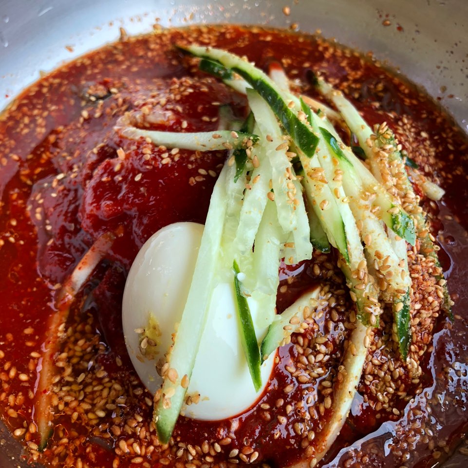 1) 비빔 냉면 : 비빔 냉면은 일단 엄청 고소하면서도 매콤하면서도 자꾸 입에 넣게 되는 맛?? ㅋㅋㅋㅋ 일단 매운걸 잘 못드시는 분들은 양념을 따로 달라고하셔서 매운맛을 조절하시면 좋을 것 같아요. 와이프는 좀 맵다고 하더라구요. 그리고 아무래도 비빔냉면이다 보니까 물냉면보다 양념이 좀 더 쎄다는 느낌을 받았습니다. 그렇다고 맛이 없다는게 아니라, 좀 더 고소한 맛이랑 매콤한 맛이 더 강하구요. 저는 둘다 먹었는데, 비빔을 먹다가 물냉면을 먹으면 좀 간이 약하다? 라는 느낌을 받을 수 있겠더라구요. 어쨋든, 비빔 냉면은 시원한 맛보다는 고소하고 매콤한 자극적인 맛 ? ㅎㅎ 어쨋든 맛있습니다. ㅋㅋㅋㅋ