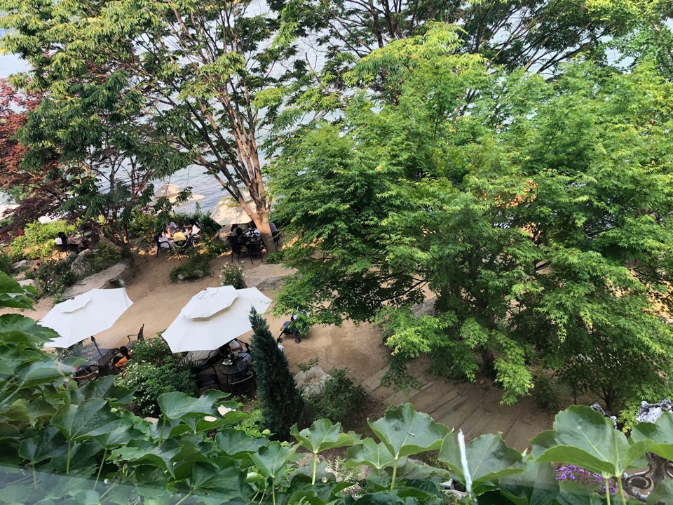2층으로 올라가는 계단에서 찍은 창밖 뷰인데요. 대박이죠? 야외 테이블들도 많이 있구요. 바로 북한강이 보인답니다.