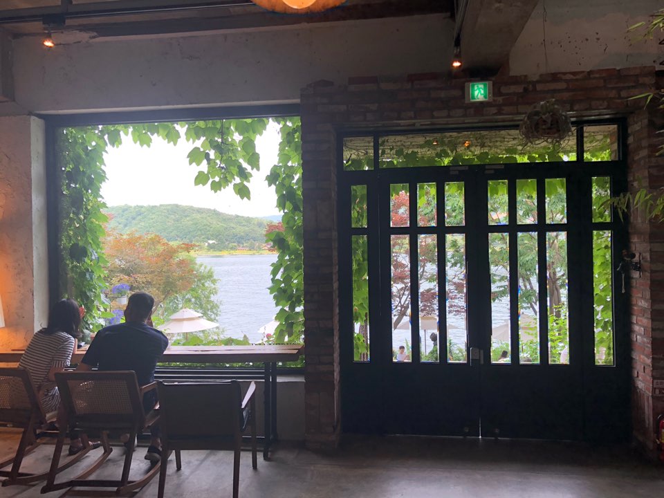예쁜 계단을 따라 내려오면, 북한강변으로 나가는 문이 또 있구요. 그리고 1층과 마찬가지로 북한강이 한눈에 보이는 전면창들이 줄지어 있답니다. 이곳은 1층과 비슷한 분위기인데, 카운터가 없어서 그나마 조용하더라구요. ㅎㅎ 그래서 저희부부는 여기서 커피 한잔의 여유를 즐겼답니다. ^^