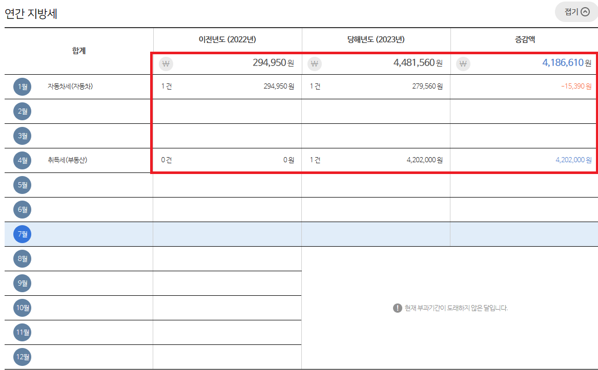 위택스에 들어가셔서 로그인 하시고, 상단 메뉴바에서 나의 위택스 -> 위택스 알리미로 들어가시면, 현재 나의 지방세 납부 현황과 전년대비 증감액을 바로 볼 수 있습니다.