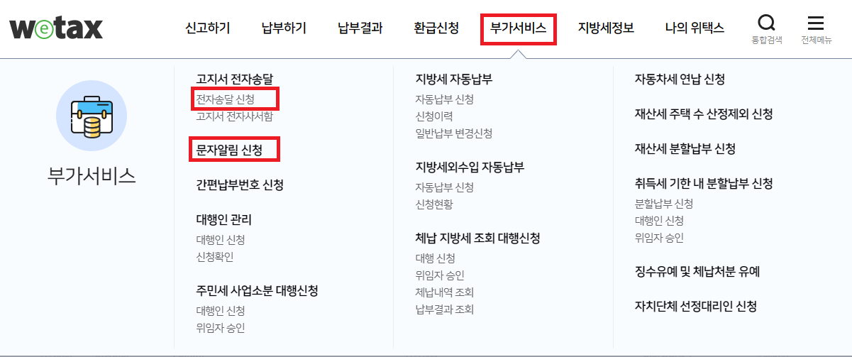 - 위택스 상단 메뉴에서 부가서비스 탭 -> 문자알림 신청 (핸드폰 번호만 입력)