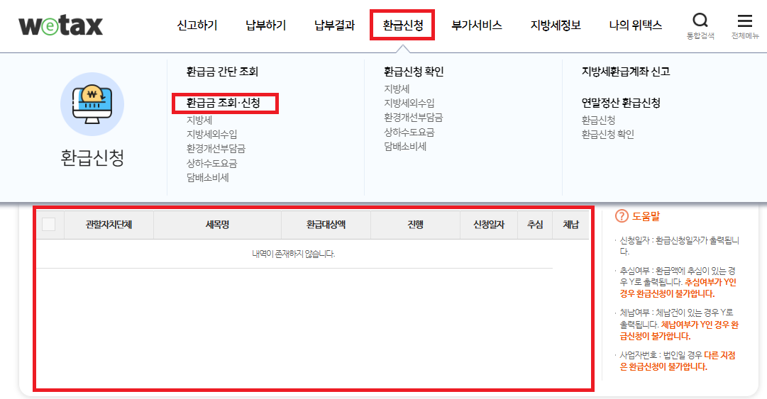 위택스 상단 메뉴에서 환급신청 탭 -> 환급금 조회, 신청 탭에 들어가시면 바로 환급금이 얼마인지 확인할 수 있습니다.