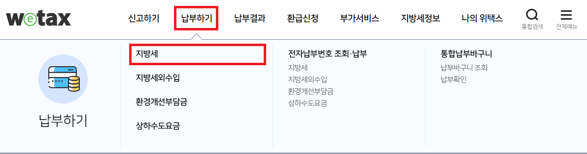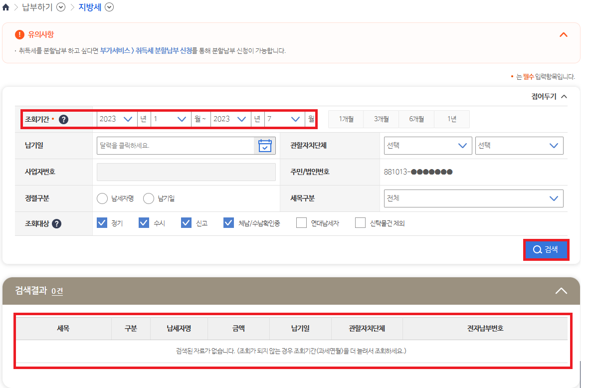 로그인이 되셨다면, 상위 메뉴에서 납부하기 탭 -> 지방세 탭으로 들어가시면 됩니다. 그럼 조회할 수 있는 창이 뜨고, 기간을 설정하여 조회하시면 조회 결과가 나옵니다.