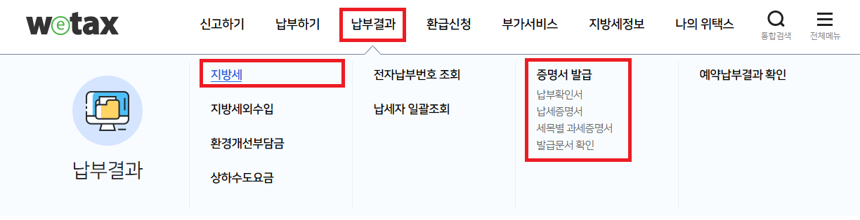 납부 결과를 확인하고 싶거나 증명서 발급을 위해서는 상위 메뉴에서 납부결과 탭 -> 지방세 또는 증명서 발급 탭을 누르시면 됩니다.
