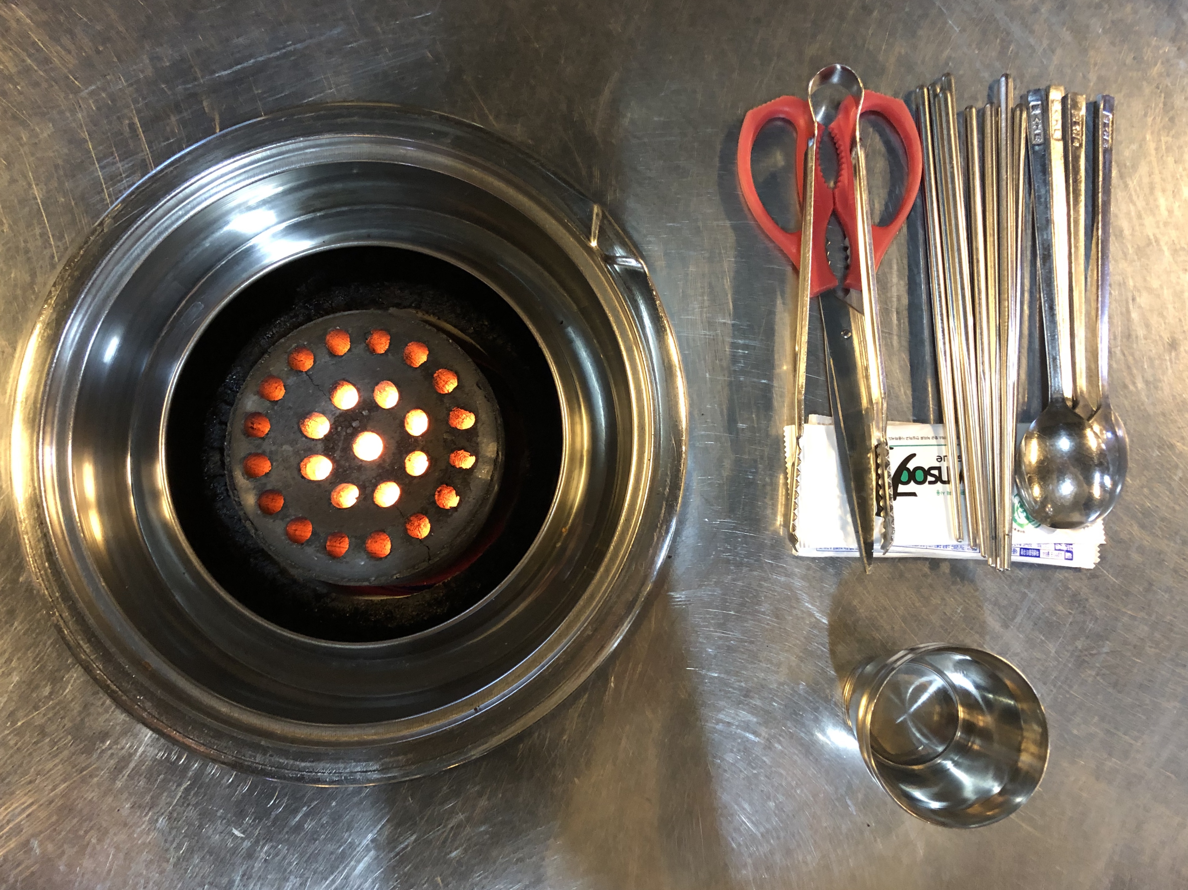우선 김치찌개가 나오고, 맬젖을 연탄위에 올려두고 끓입니다. ㅎㅎ 저희는 김치찌개에 한라산 한잔~!